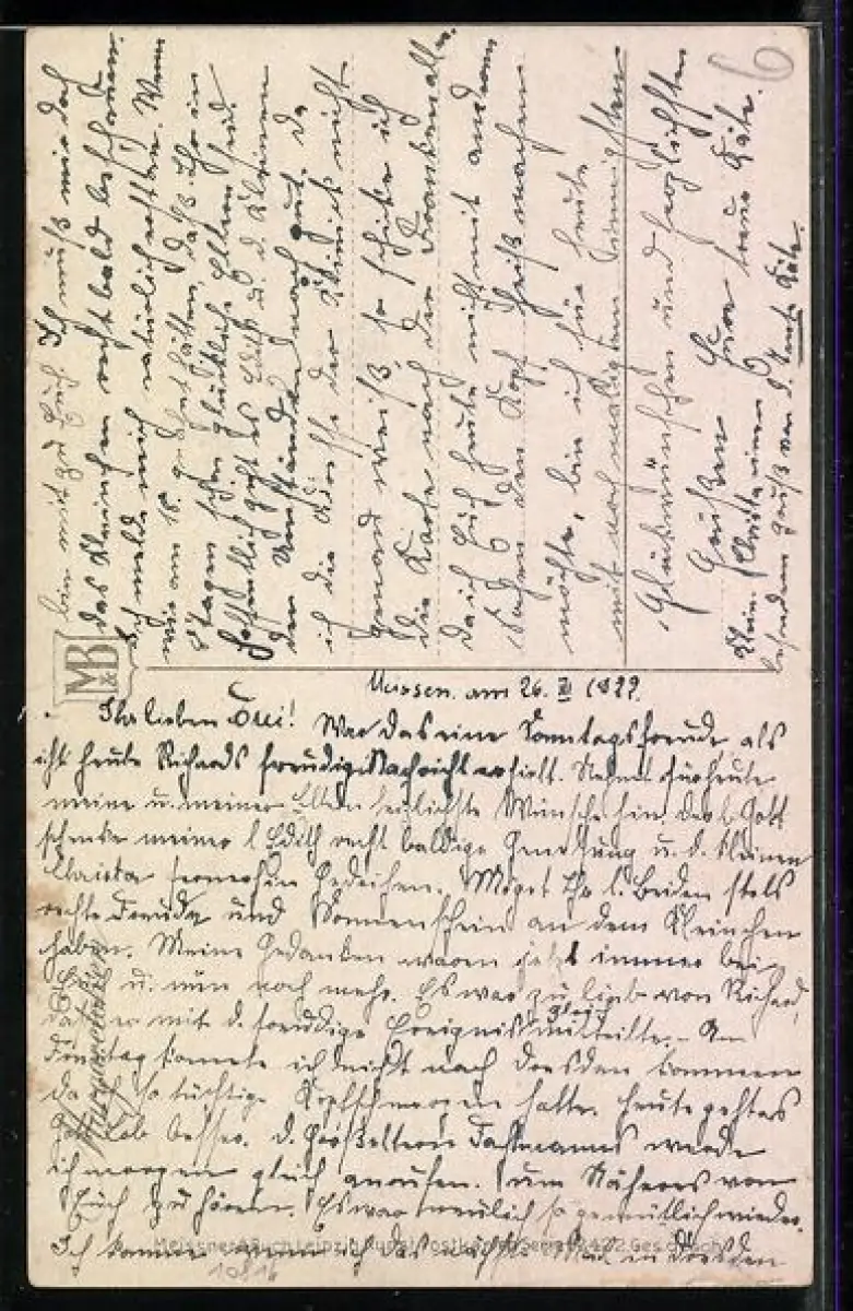 Personenbezogene Daten auf der Rückseite der Karte wurden durch blauen Textmarker unkenntlich gemacht. Die blauen Stellen sind auf die Vorderseite durchgeweicht und wirken sich negativ auf das Postkartenfoto aus