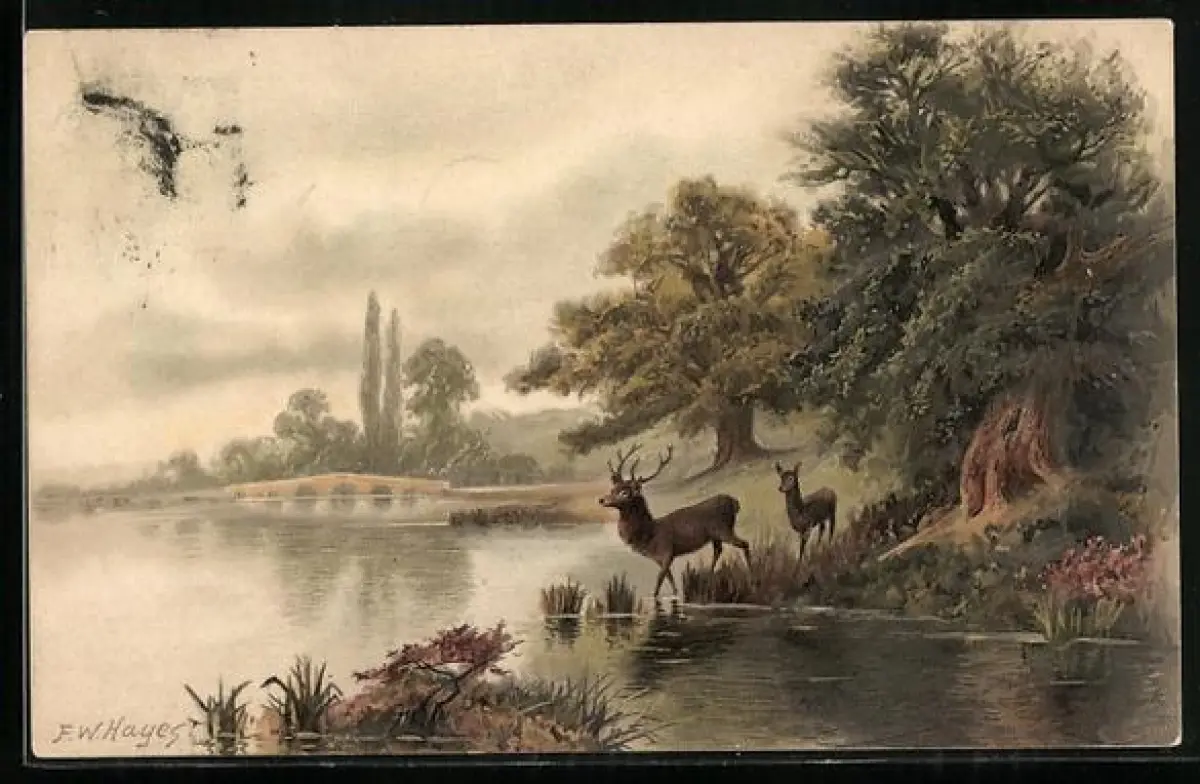 Künstler-AK Meissner & Buch (M&B) Nr. 1263: Reh und Hirsch am Seeufer