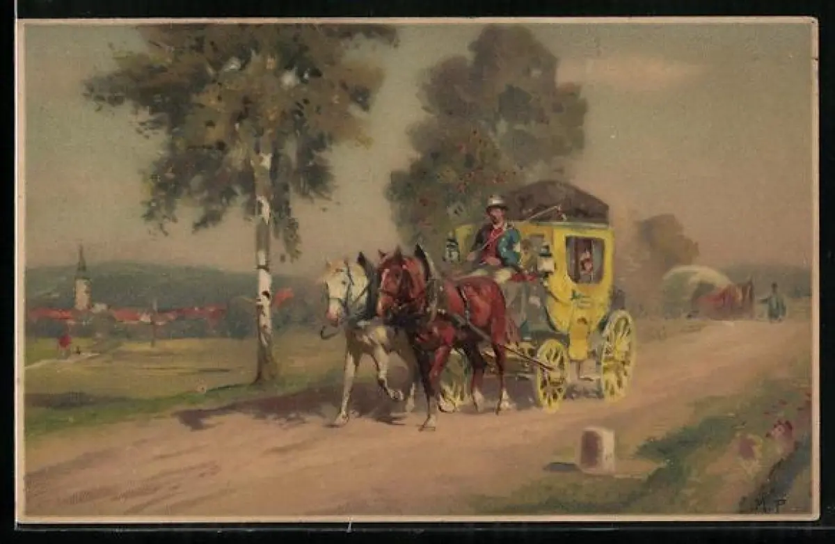 Künstler-AK Meissner & Buch (M&B) Nr. 1450: Reisen im Gebirge, Fahrt mit Postkutsche