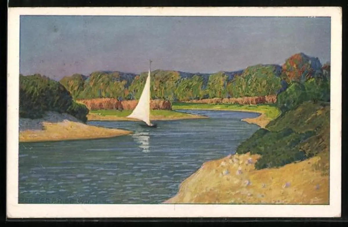 Künstler-AK Meissner & Buch (M&B) Nr. 2228: Segeljolle auf einem Gewässer