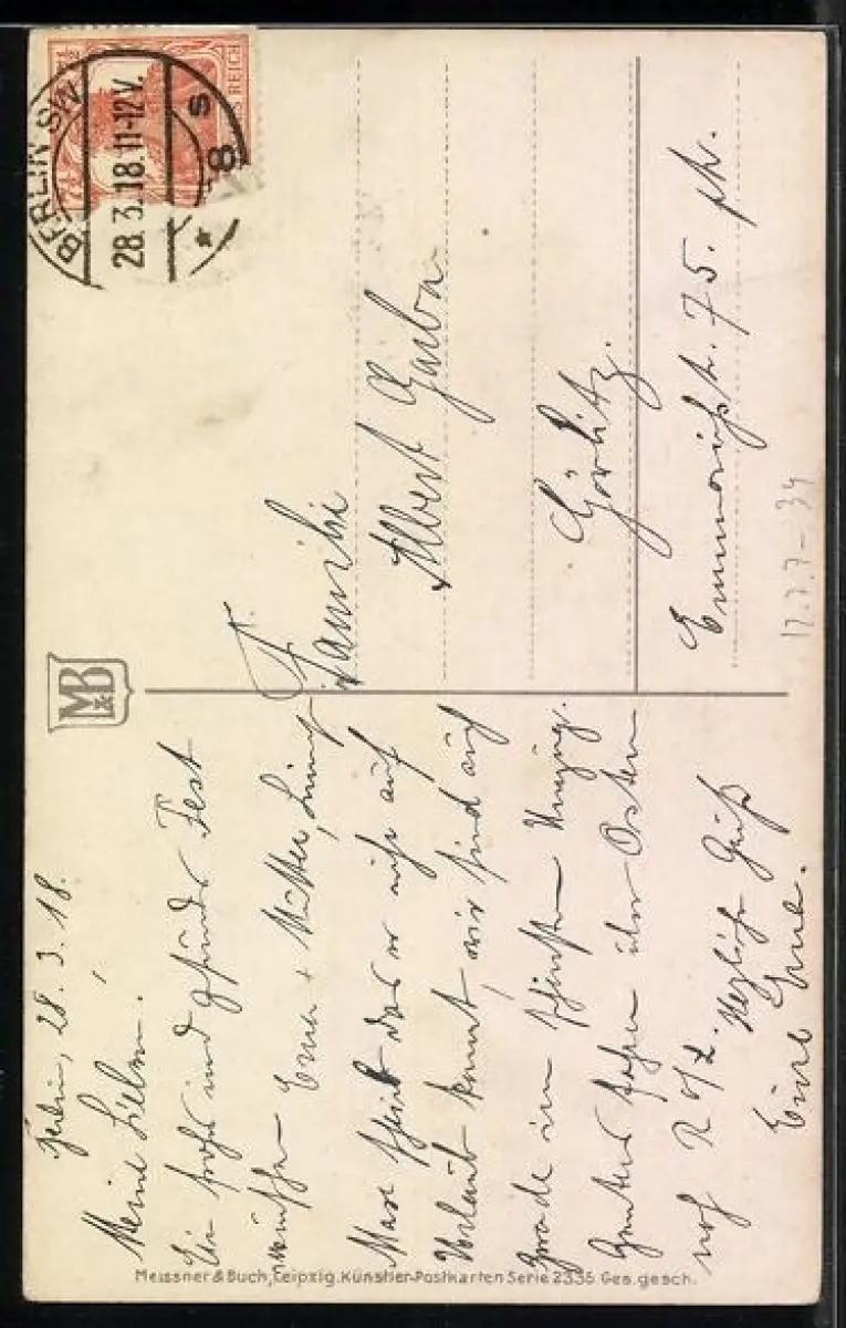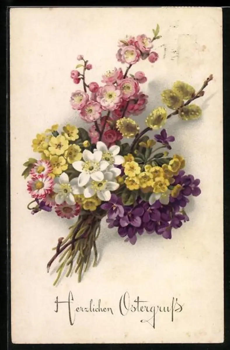 Künstler-AK Meissner & Buch (M&B) Nr. 2335: Veilchen und Primeln im Bund, Ostergruss