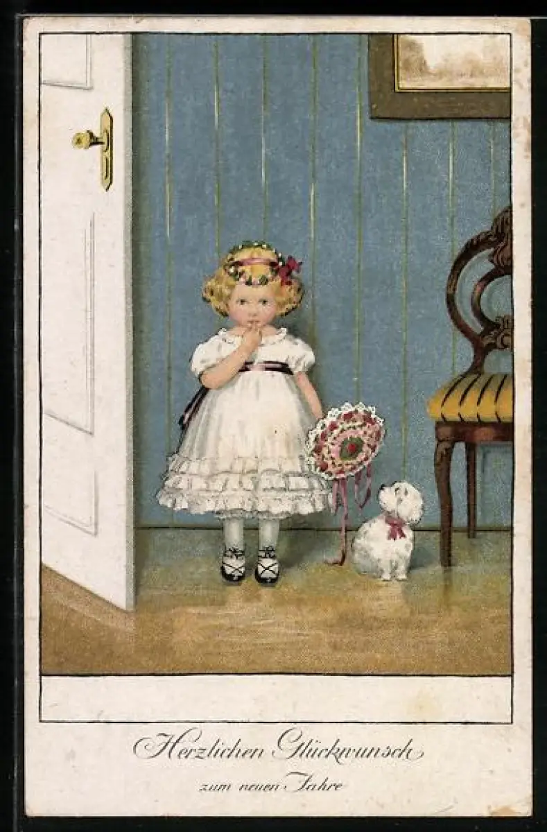 Künstler-AK Meissner & Buch (M&B) Nr. 2471: Mädchen mit Blumenstrauss, Neujahrsgruss