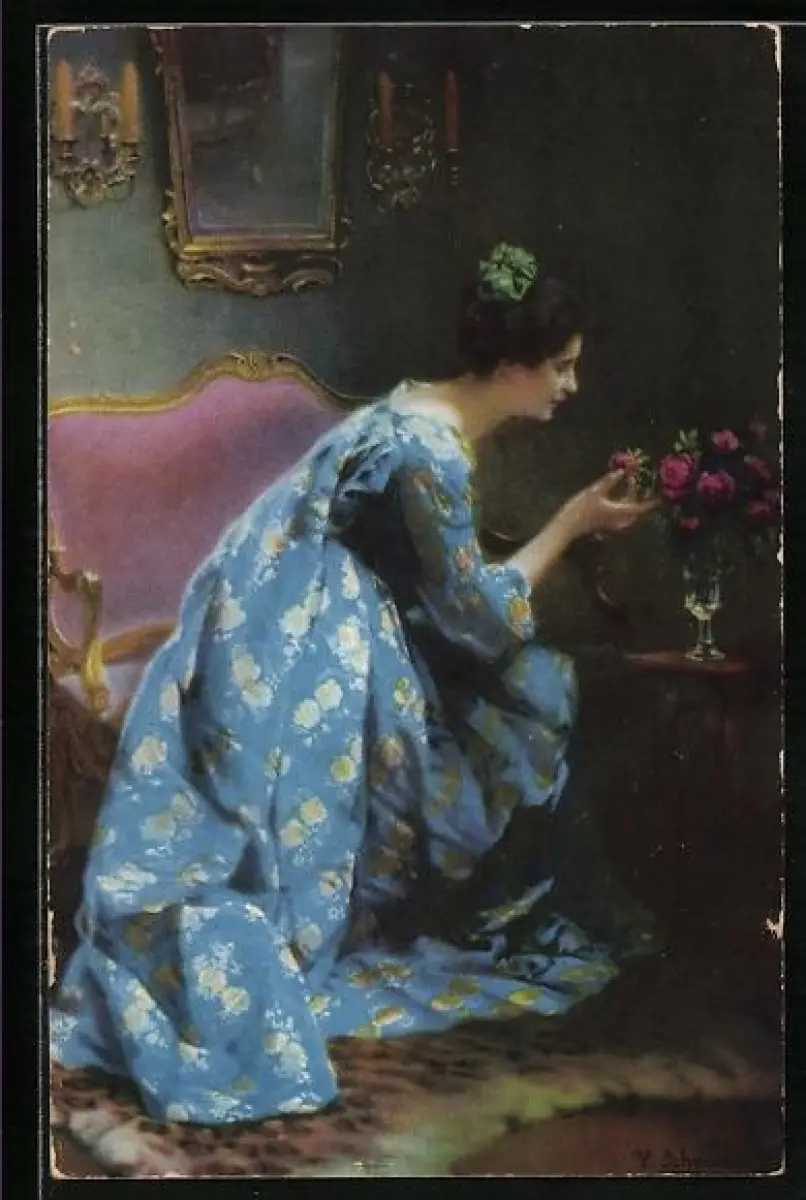 Künstler-AK Meissner & Buch (M&B) Nr. 2617: Die blaue Dame, Frau mit Rosenstrauss