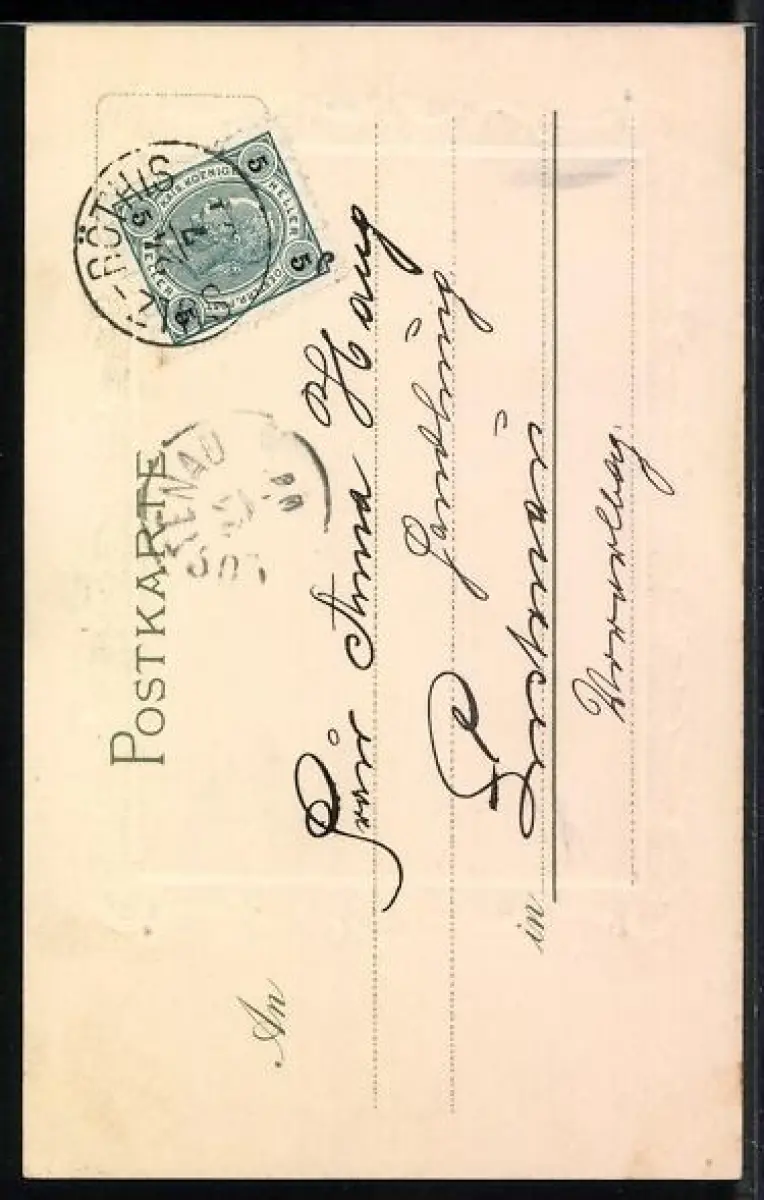 Personenbezogene Daten auf der Rückseite der Karte wurden durch blauen Textmarker unkenntlich gemacht. Die blauen Stellen sind auf die Vorderseite durchgeweicht und wirken sich negativ auf das Postkartenfoto aus