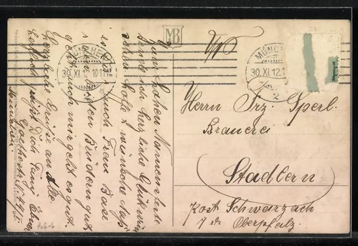 Personenbezogene Daten auf der Rückseite der Karte wurden durch blauen Textmarker unkenntlich gemacht. Die blauen Stellen sind auf die Vorderseite durchgeweicht und wirken sich negativ auf das Postkartenfoto aus