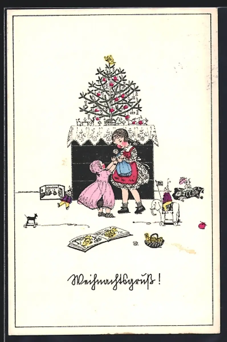 Künstler-AK Mela Köhler, Deutscher Schulverein Nr. 1143: Kinder spielen mit Puppen zu Weihnachten