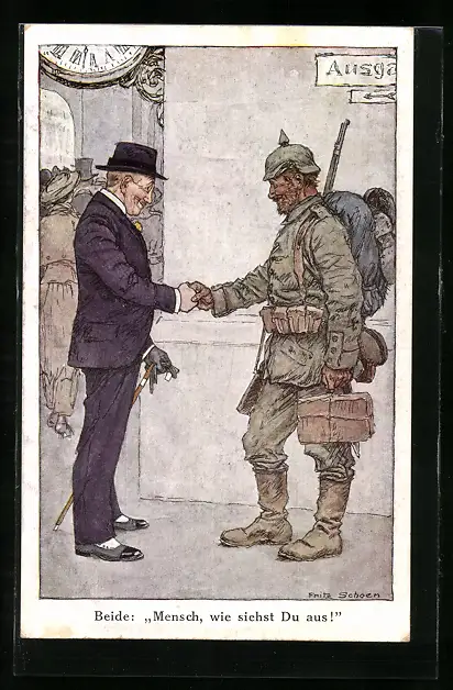 Künstler-AK Mensch, wie siehst Du aus!, Nobler Herr und Soldat reichen sich die Hand