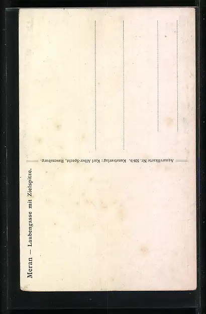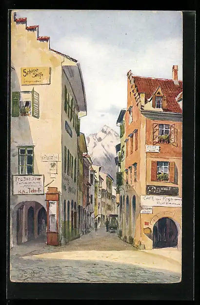 Künstler-AK Meran, Laubengasse mit Cafe & Zielspitze