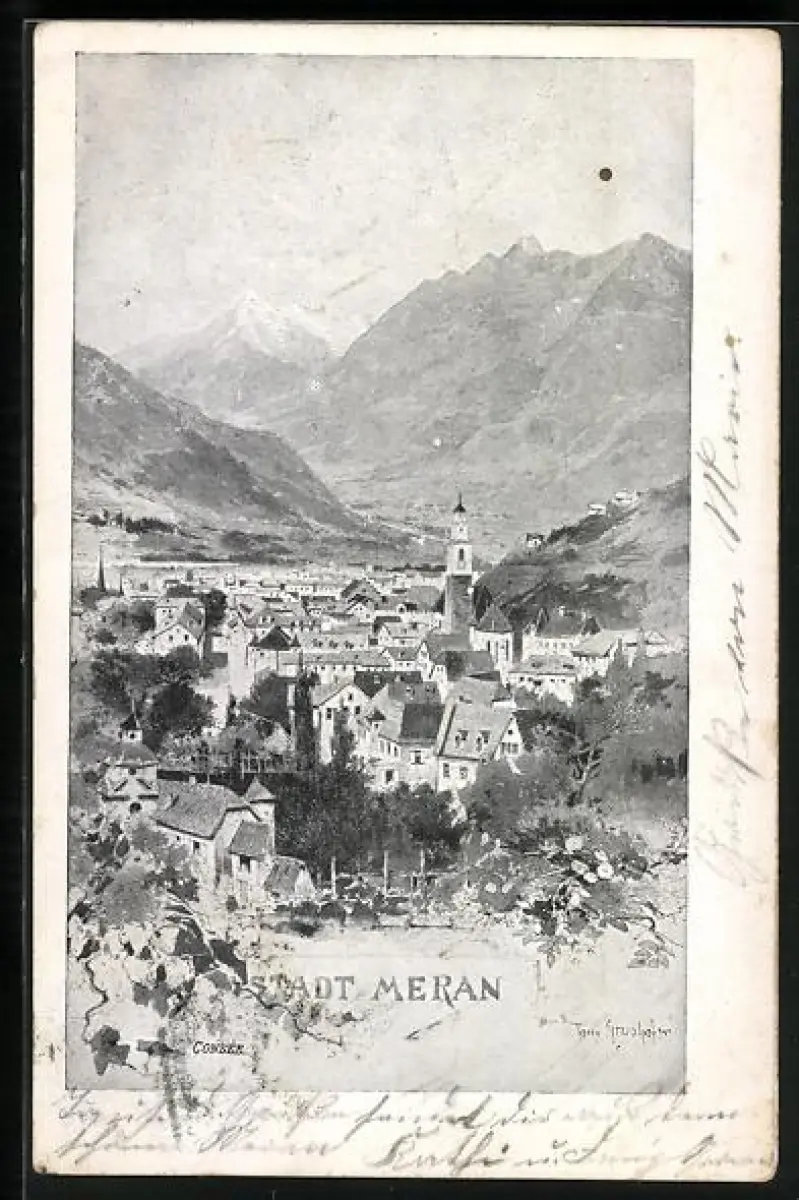 Künstler-AK Meran, Ortsansicht aus der Vogelschau