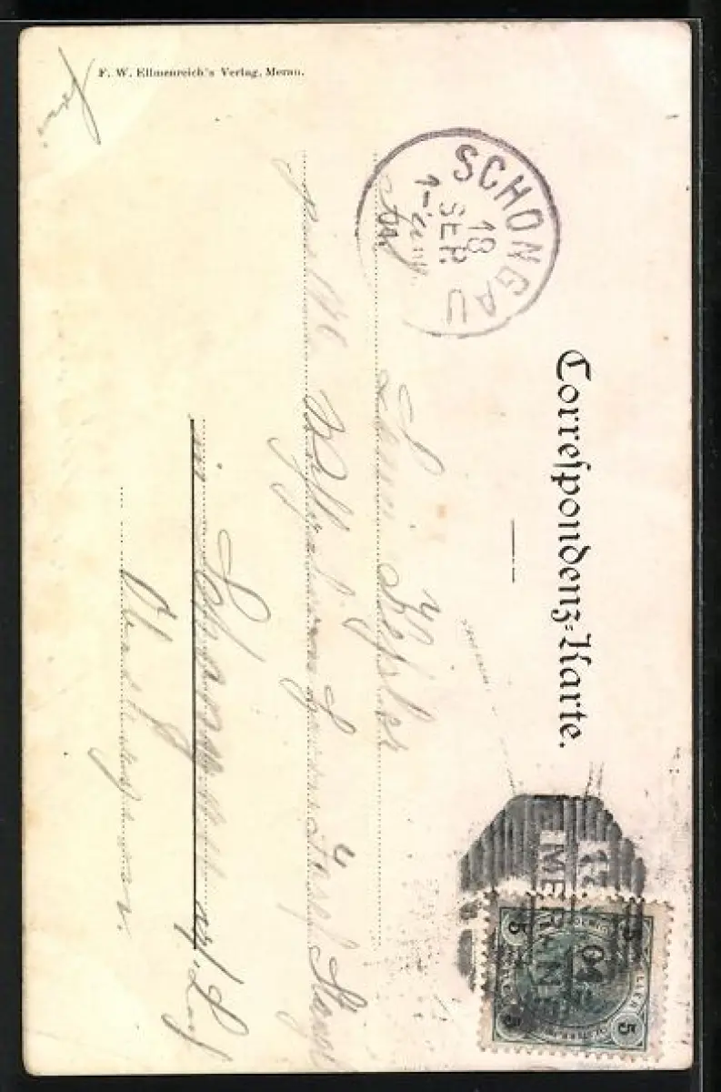 Personenbezogene Daten auf der Rückseite der Karte wurden durch blauen Textmarker unkenntlich gemacht. Die blauen Stellen sind auf die Vorderseite durchgeweicht und wirken sich negativ auf das Postkartenfoto aus
