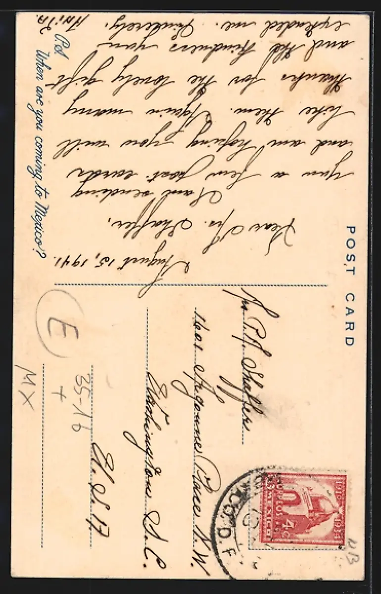 Personenbezogene Daten auf der Rückseite der Karte wurden durch blauen Textmarker unkenntlich gemacht. Die blauen Stellen sind auf die Vorderseite durchgeweicht und wirken sich negativ auf das Postkartenfoto aus