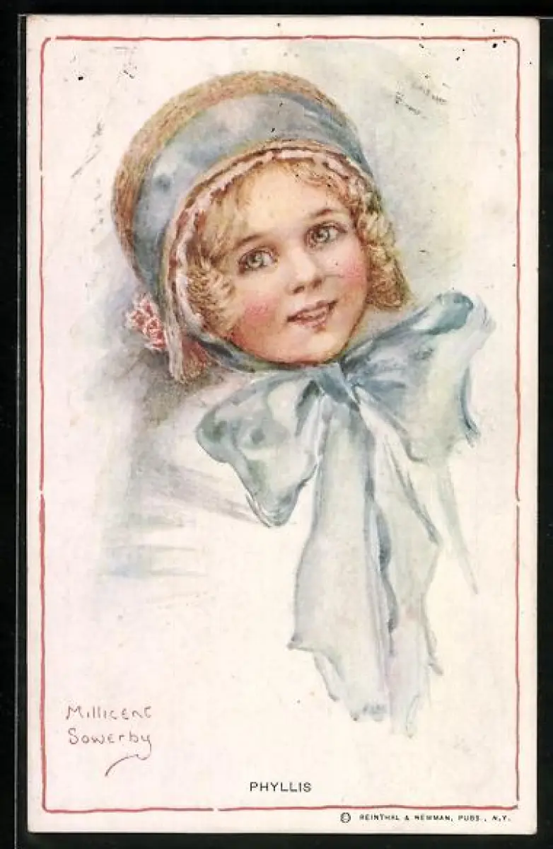 Künstler-AK Millicent Sowerby: Junges Mädchen mit blondem Haar und blauer Schleife um den Hals