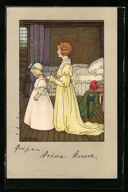 Künstler-AK Millicent Sowerby: Mutter bindet der Tochter das Kleid