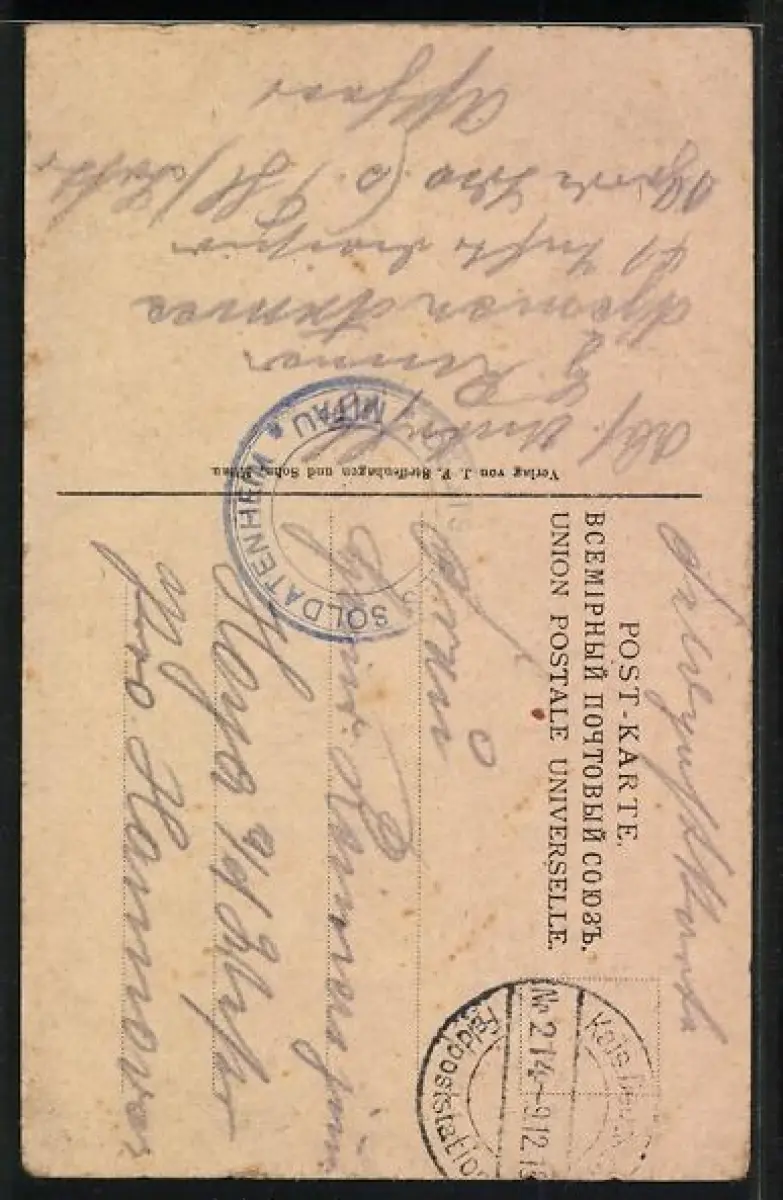 Personenbezogene Daten auf der Rückseite der Karte wurden durch blauen Textmarker unkenntlich gemacht. Die blauen Stellen sind auf die Vorderseite durchgeweicht und wirken sich negativ auf das Postkartenfoto aus