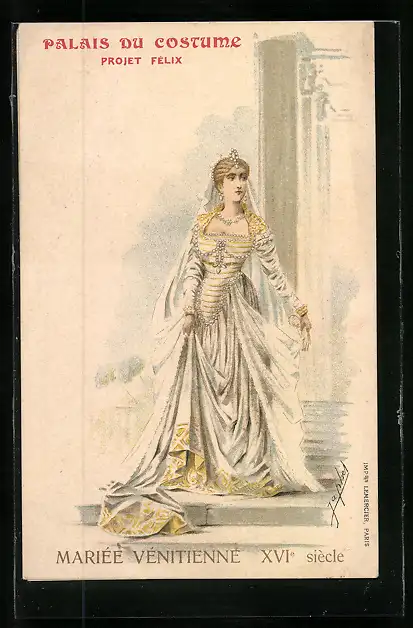 Künstler-AK Mode, Dame in weissem Kleid mit Perlen Applikationen und Raffungen, Mariee Venitienne