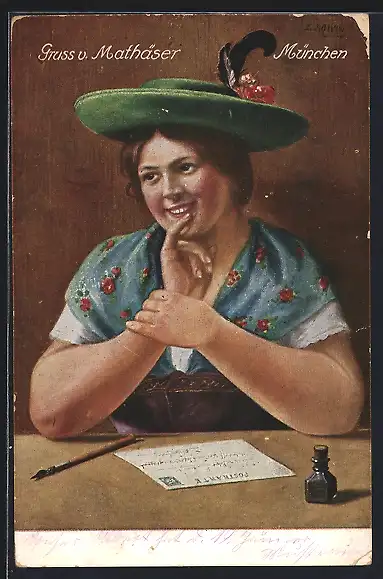Künstler-AK München, Frau in Tracht schreibt eine Postkarte, Gruss v. Mathäser