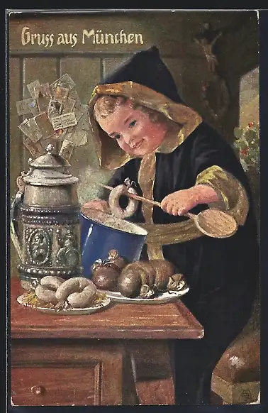 Künstler-AK München, Münchner Kindl mit Weisswürsten am Tisch