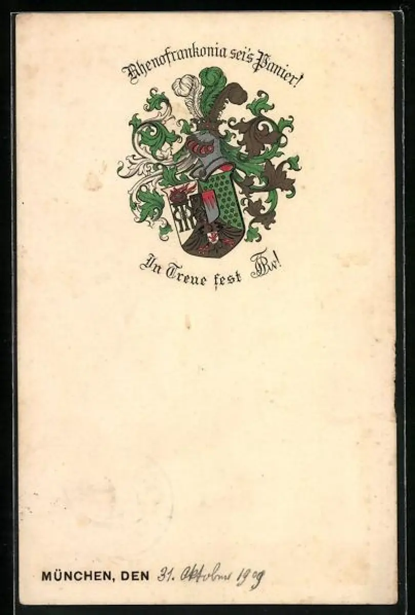 Künstler-AK München, Studentenwappen mit Helm, Rhenofrankonia sei`s Panier