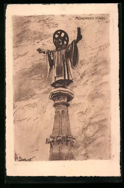 Künstler-AK Münchner Kindl auf der Rathausturmspitze