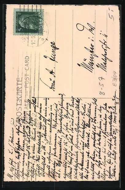 Personenbezogene Daten auf der Rückseite der Karte wurden durch blauen Textmarker unkenntlich gemacht. Die blauen Stellen sind auf die Vorderseite durchgeweicht und wirken sich negativ auf das Postkartenfoto aus