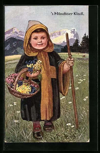 Künstler-AK Münchner Kindl mit Blumenkorb in einer Berglandschaft