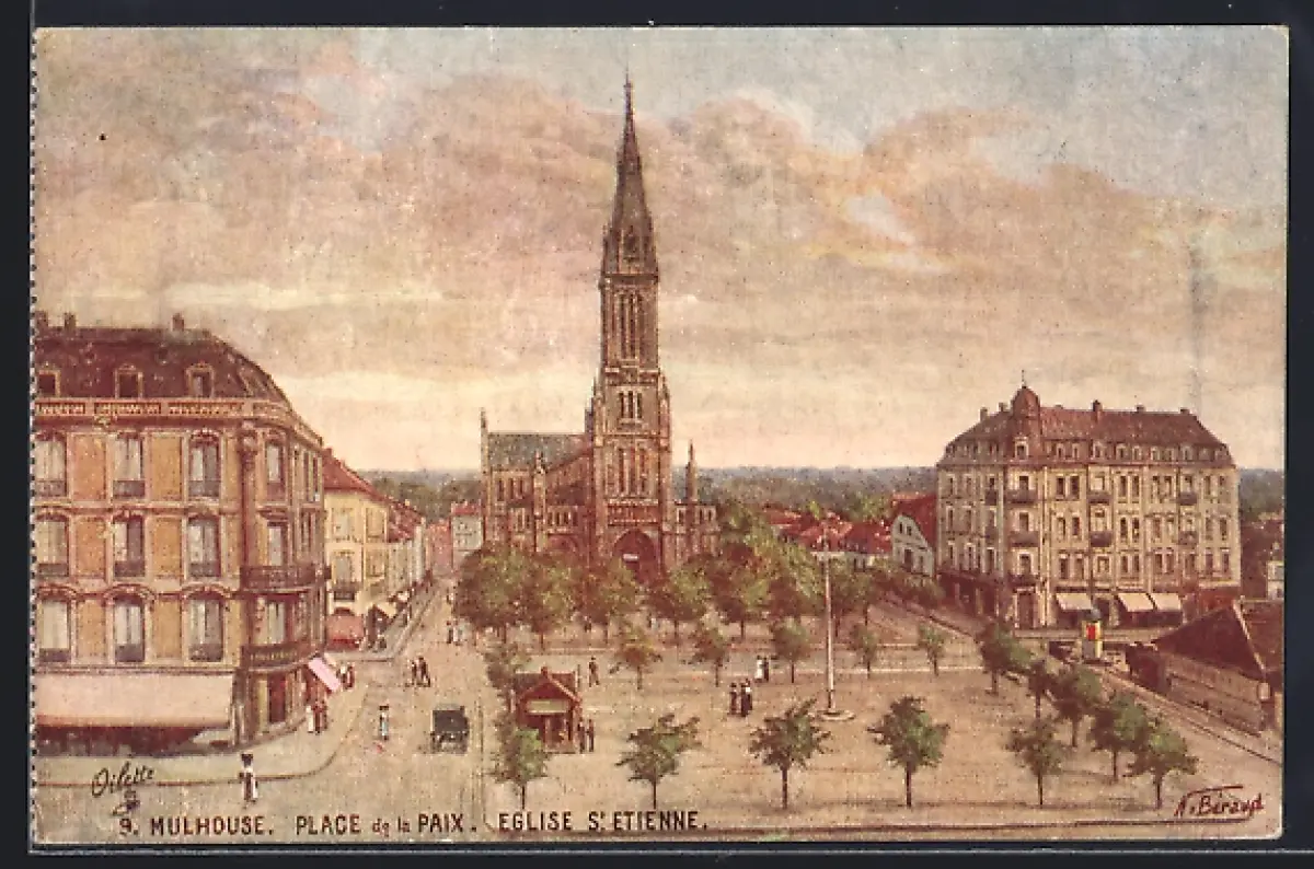 Künstler-AK Mulhouse, Place de la Paix, Église St-Étienne