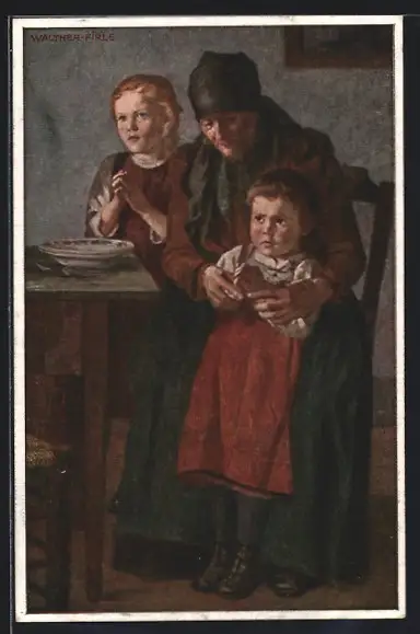 Künstler-AK Mutter mit zwei Kindern beim Gebet vor dem Essen, Kinderfürsorge