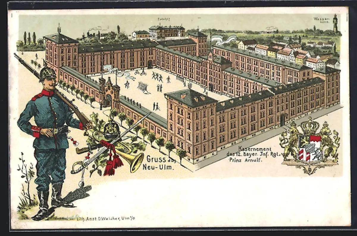 Künstler-AK Neu-Ulm, Kasernement des 12. Bayer. Inf. Rgt. Prinz Arnulf mit Bahnhof und Wasserturm, Soldat mit Gewehr