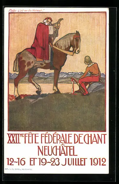 Künstler-AK Neuchâtel, XXIIme Fête Fédérale de Chant 1912, Älterer Mann mit Harfe zu Pferde