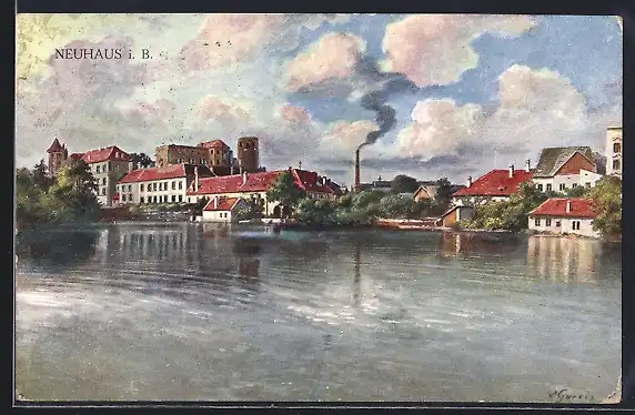 Künstler-AK Neuhaus / Jindrichuv Hradec, Teilansicht