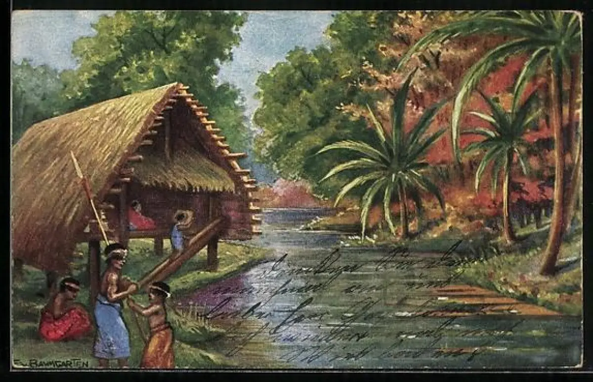 Künstler-AK Neumecklenburg, Eingeborene an einer Hütte