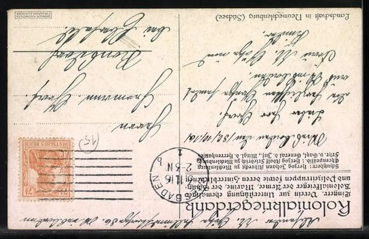 Personenbezogene Daten auf der Rückseite der Karte wurden durch blauen Textmarker unkenntlich gemacht. Die blauen Stellen sind auf die Vorderseite durchgeweicht und wirken sich negativ auf das Postkartenfoto aus