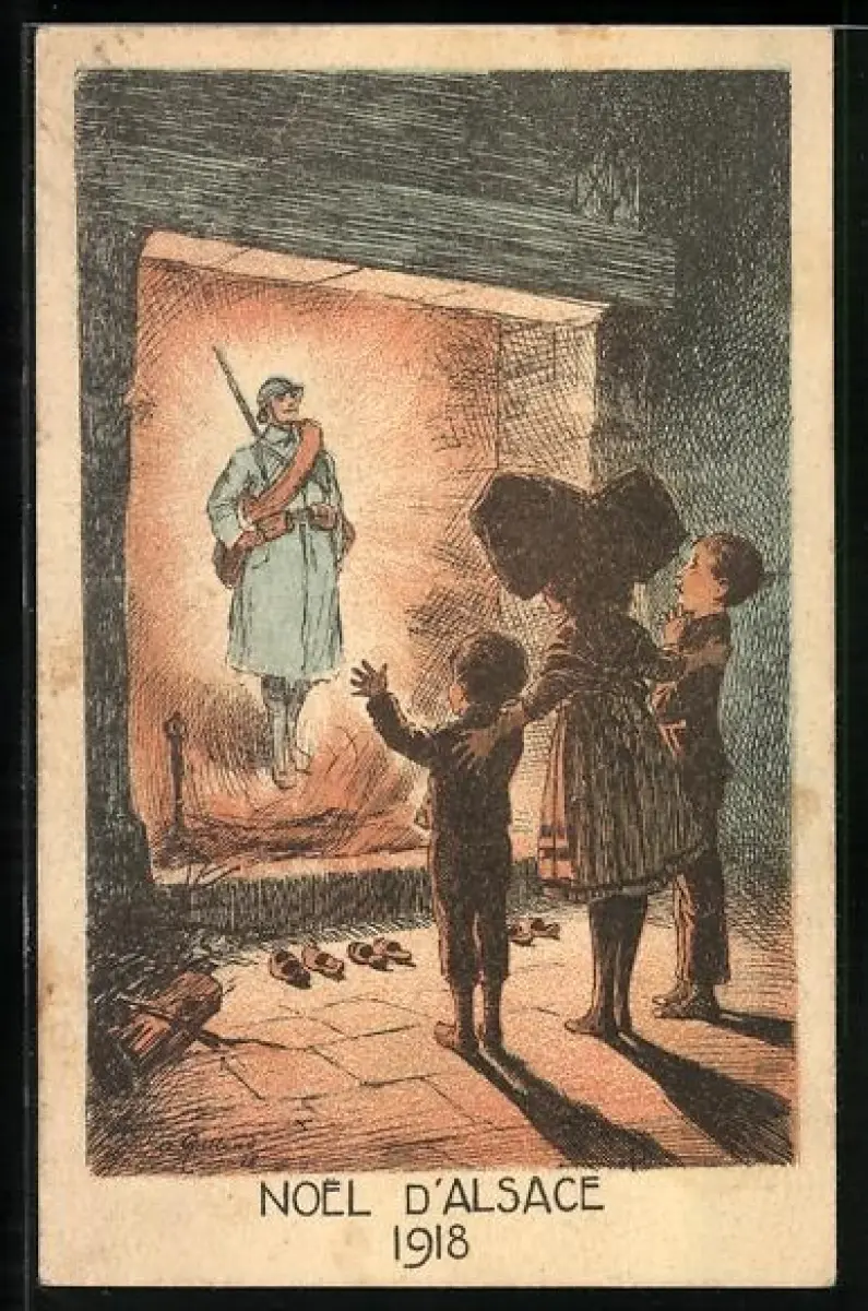 Künstler-AK Noel D'Alsace 1918, französischer Soldat geht für das Elsass durchs Feuer