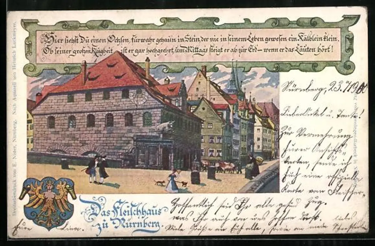 Künstler-AK Nürnberg, Deutscher Fleischertag 1900, Fleischhaus, Wappen