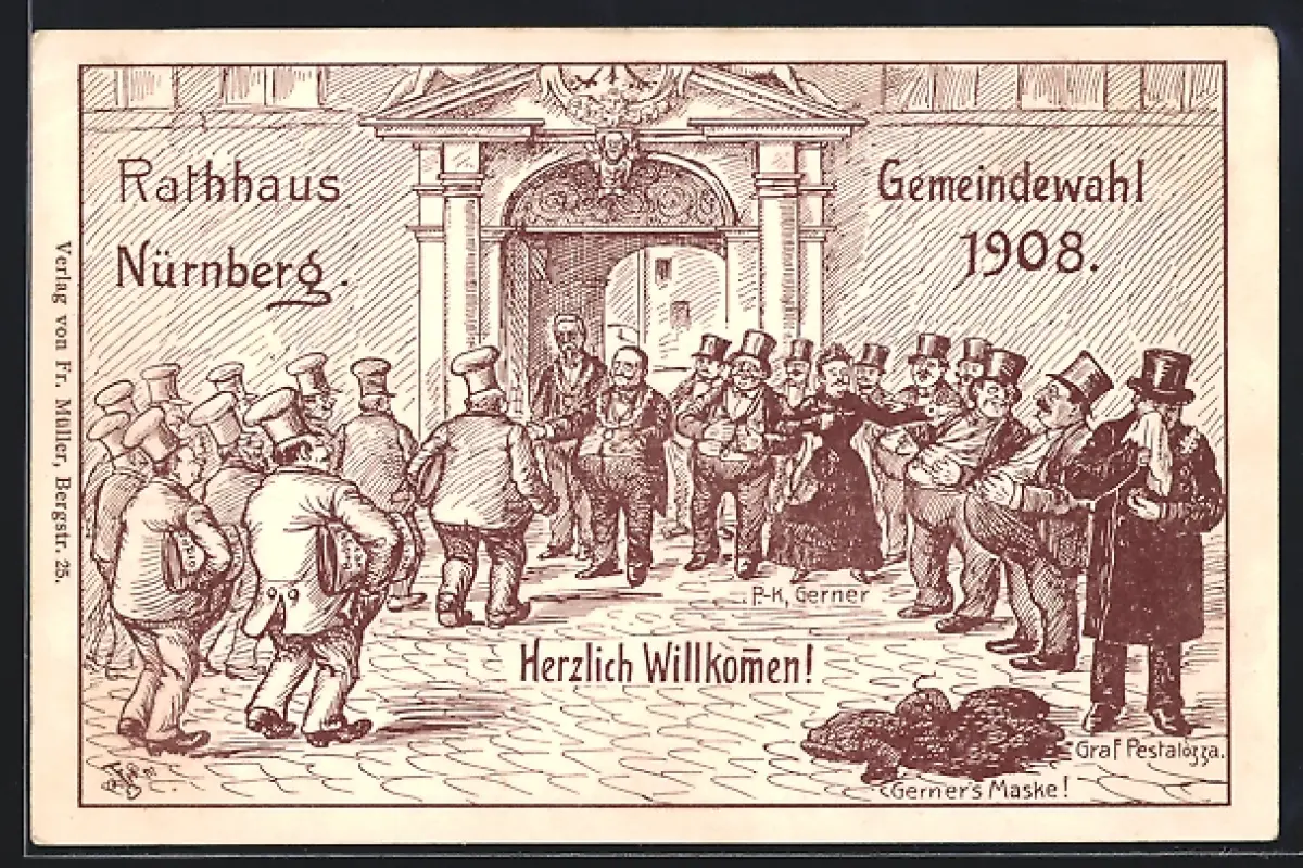 Künstler-AK Nürnberg, Gemeindewahl 1908, vor dem Rathaus