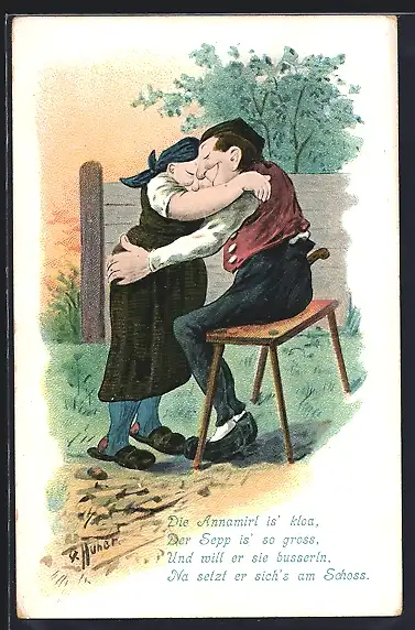 Künstler-AK O. Huber: Bauernpaar umarmt sich auf einer Holzbank