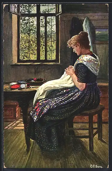 Künstler-AK O.F. Berg: Trautes Heim, junge Frau bei der Handarbeit in der Stube, Heimarbeit