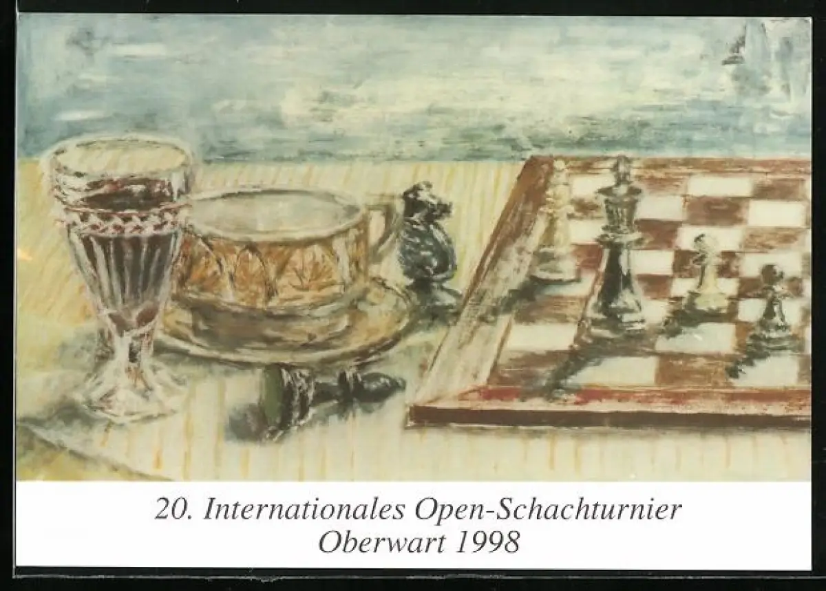 Künstler-AK Oberwart, 20. Internationales Open-Schachturnier 1998, Schachbrett auf einem Tisch