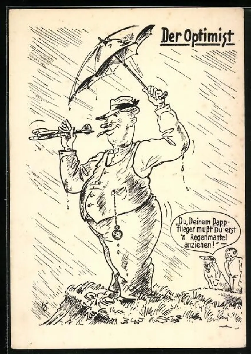 Künstler-AK Optimist mit Papierflieger steht im Regen, Segelflieger