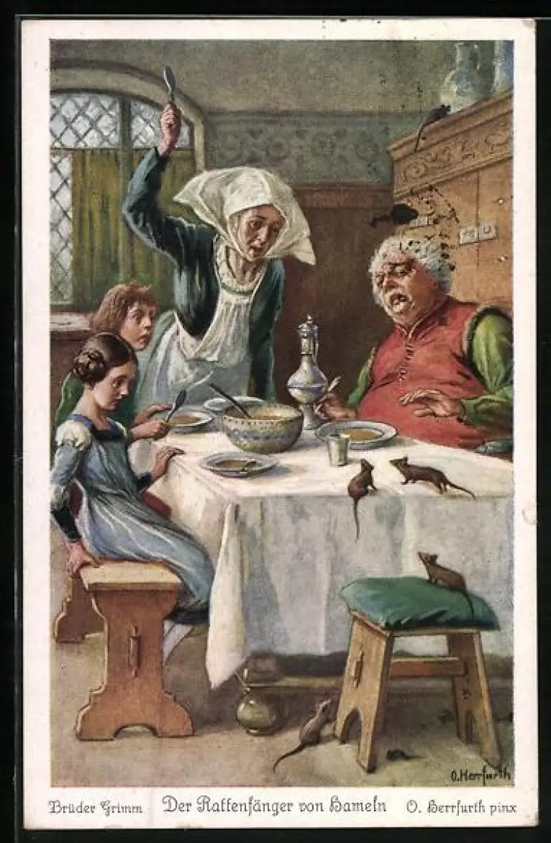 Künstler-AK Oskar Herrfurth: Brüder Grimm, Der Rattenfänger von Hameln Nr. 1, Ratten auf dem Esstisch
