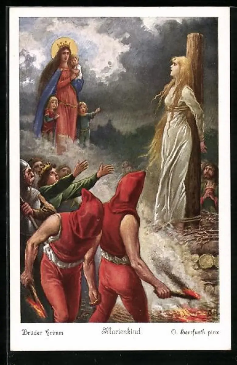 Künstler-AK Oskar Herrfurth: Brüder Grimms Marienkind: Über die verstockte Königin wurde nun Gericht gehalten ...