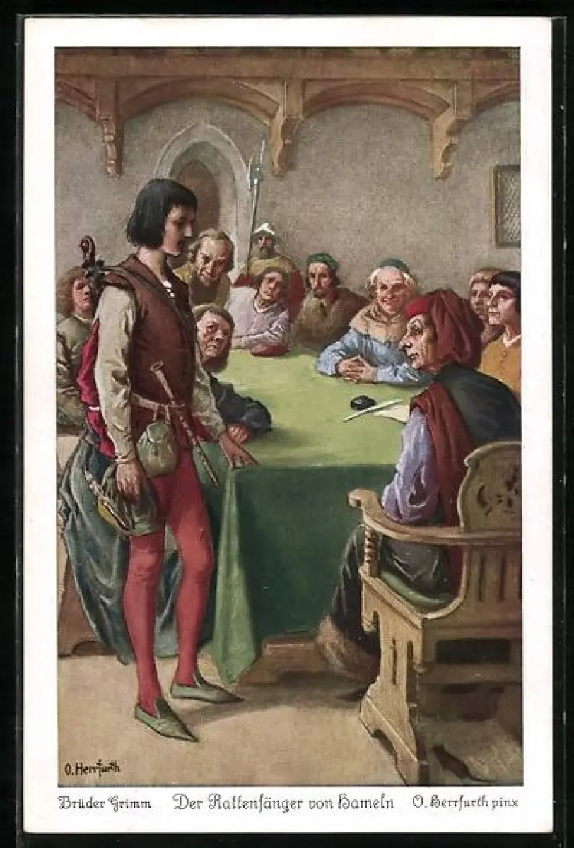 Künstler-AK Oskar Herrfurth: Der Rattenfänger von Hameln preist den Bürgern seinen Dienst an