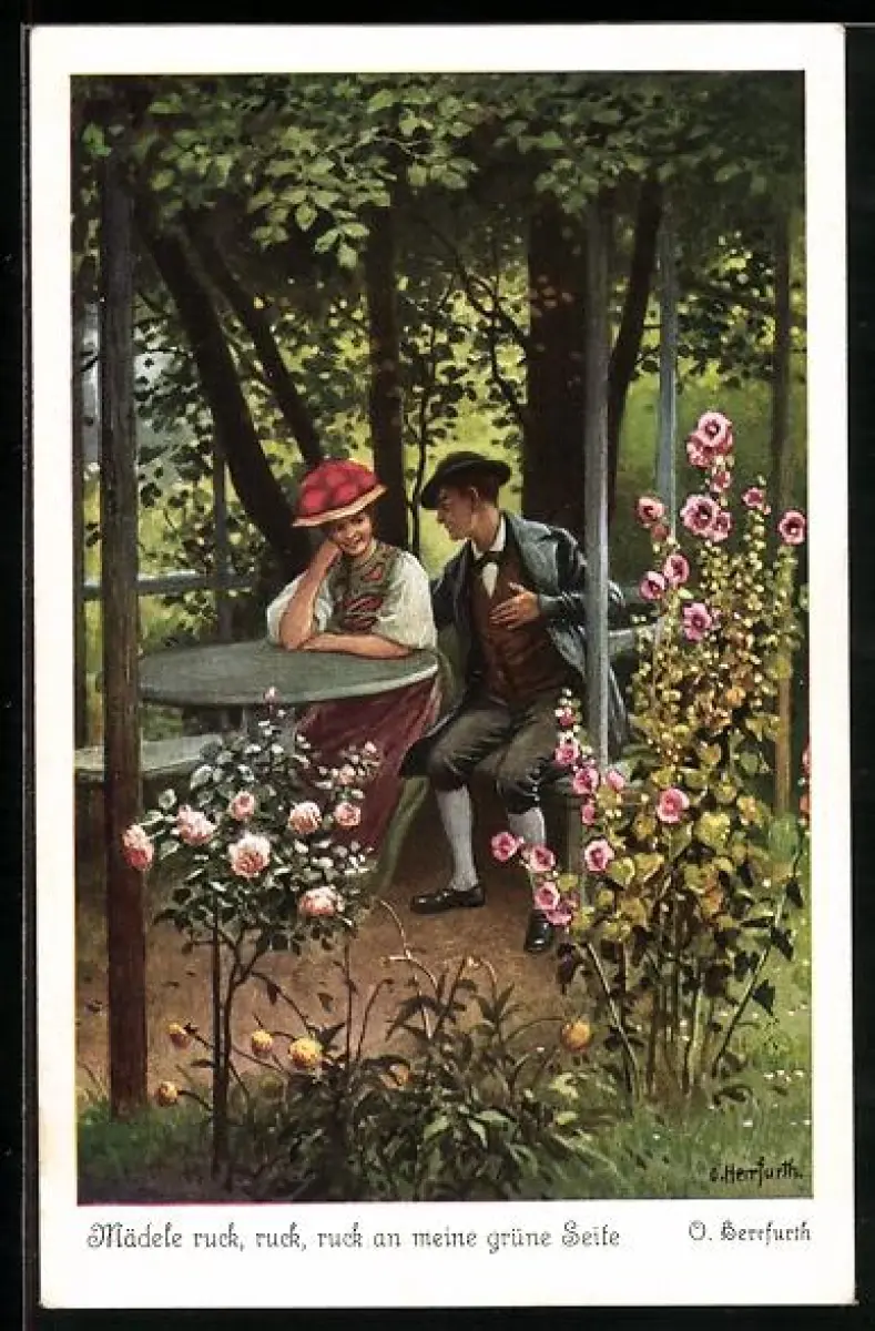 Künstler-AK Oskar Herrfurth: Schwarzwaldmädel in Tracht sitzt neben ihrem Geliebten