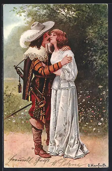 Künstler-AK Oskar Herrfurth: Trompeter küsst eine junge Frau