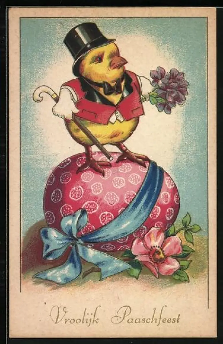 Künstler-AK Osterküken mit Hut und Gehstock steht auf einem Osterei, Vroolijk Paaschfeest