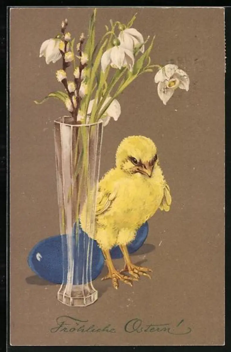 Künstler-AK Osterküken neben einer Blumenvase mit Weidenkätzchen, Fröhliche Ostern