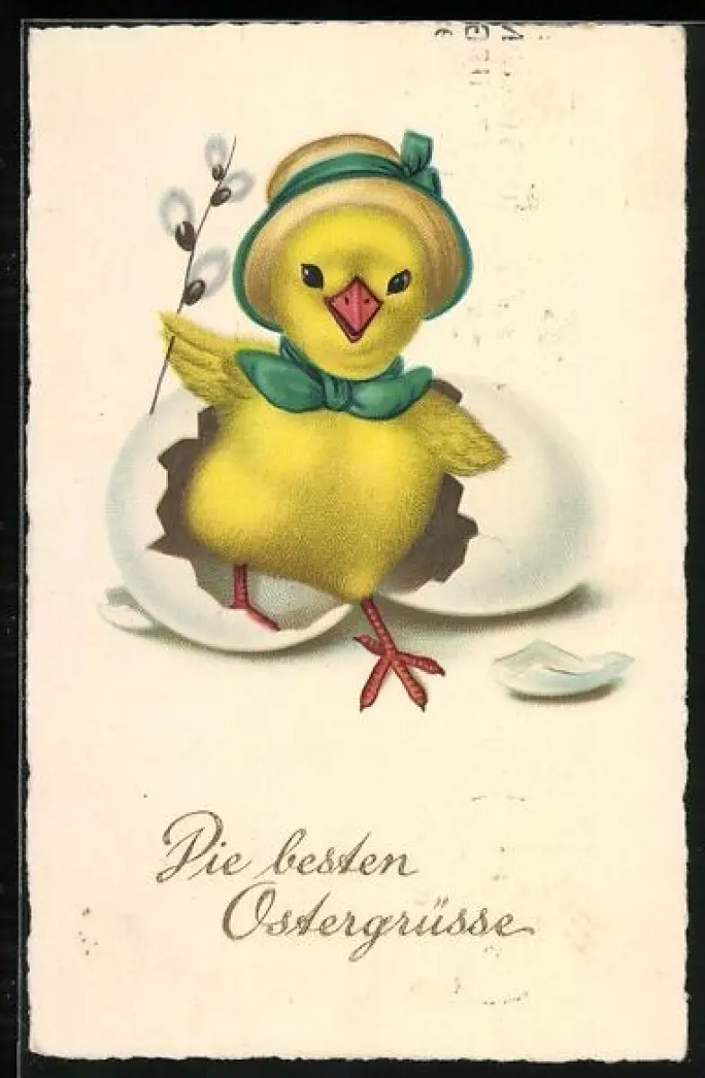 Künstler-AK Osterküken schlüpft mit einem Zweig Weidenkätzchen aus einem Ei, Die besten Ostergrüsse