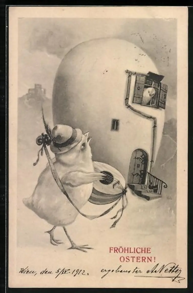 Künstler-AK Osterküken spielt Ständchen am Eier-Haus, Fröhliche Ostern