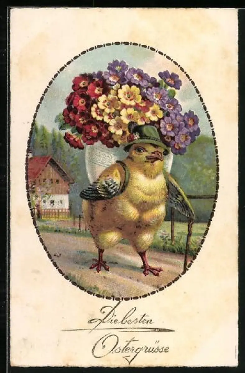 Künstler-AK Osterküken trägt einen Korb voller Blumen auf dem Rücken, Die besten Ostergrüsse