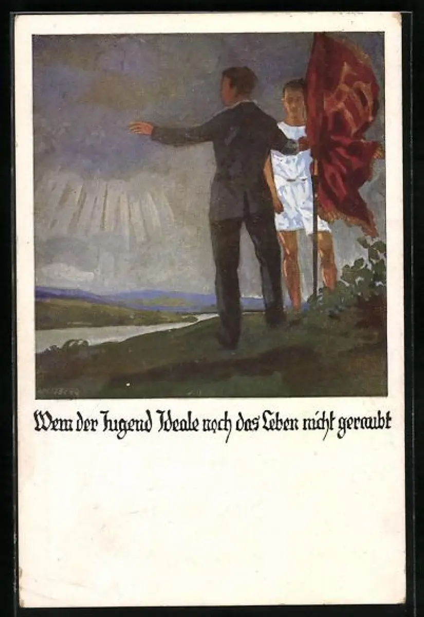 Künstler-AK Otto Amtsberg: Wenn der Jugend Ideale noch das Leben nicht geraubt, Zwei junge Männer mit Fahne